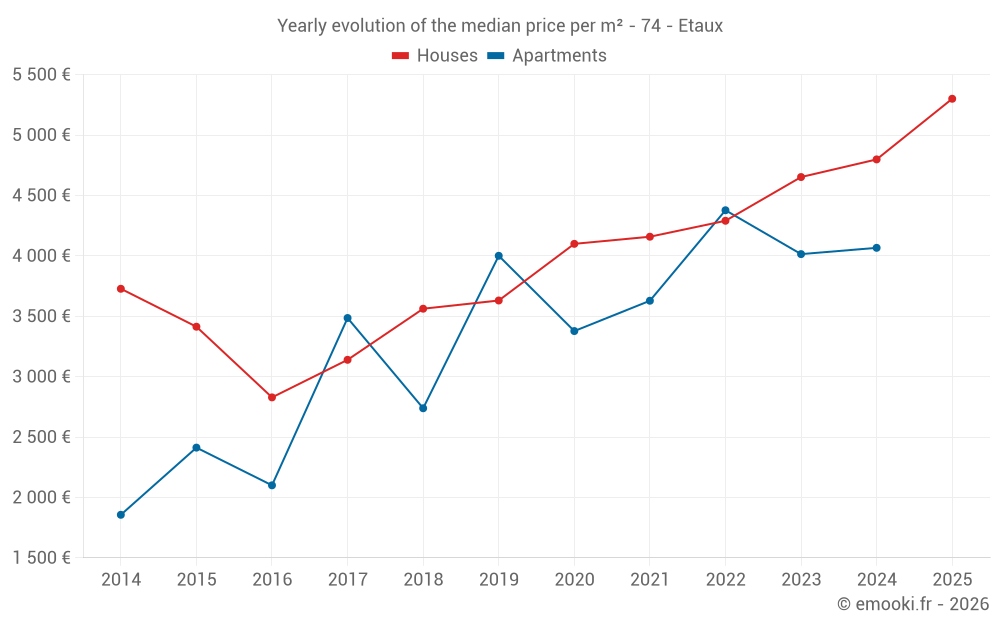 The median price on the 20 house transactions of the last 24 months in the municipality of Etaux was 4 652 € per square meter for a median property value of 487 000 €. Over this period, 60% of transactions were between 3 526 and 5 125 € per square meter (from the 2nd to the 8th deciles).