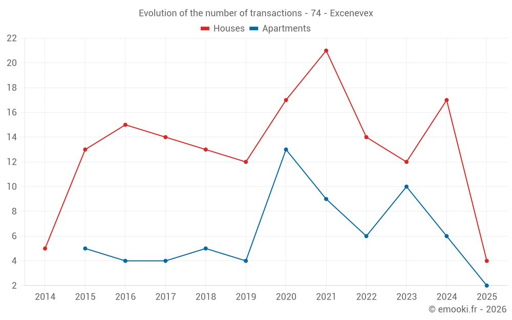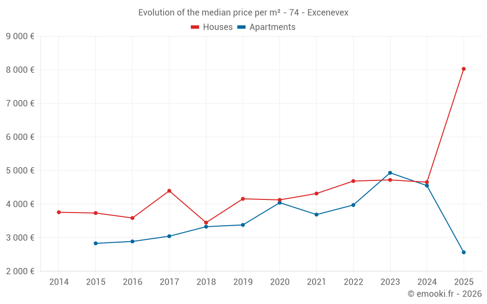 The median price on the 27 house transactions of the last 24 months in the municipality of Excenevex was 4 900 € per square meter for a median property value of 420 000 €. Over this period, 60% of transactions were between 3 162 and 5 698 € per square meter (from the 2nd to the 8th deciles).