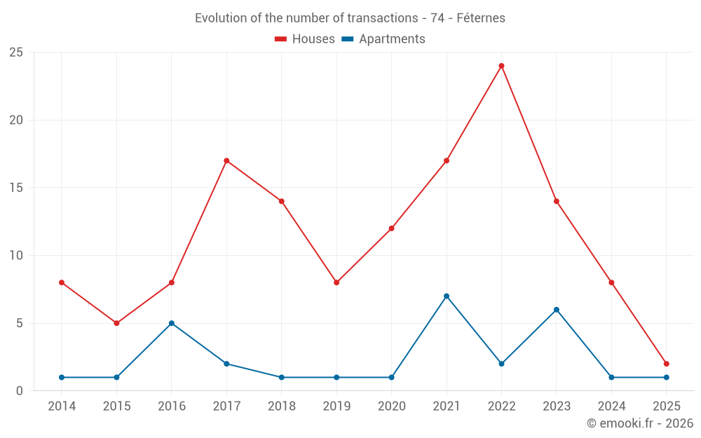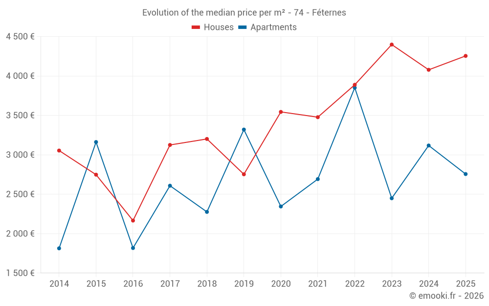 The median price on the 16 house transactions of the last 24 months in the municipality of Féternes was 4 470 € per square meter for a median property value of 432 500 €. Over this period, 60% of transactions were between 2 769 and 5 247 € per square meter (from the 2nd to the 8th deciles).