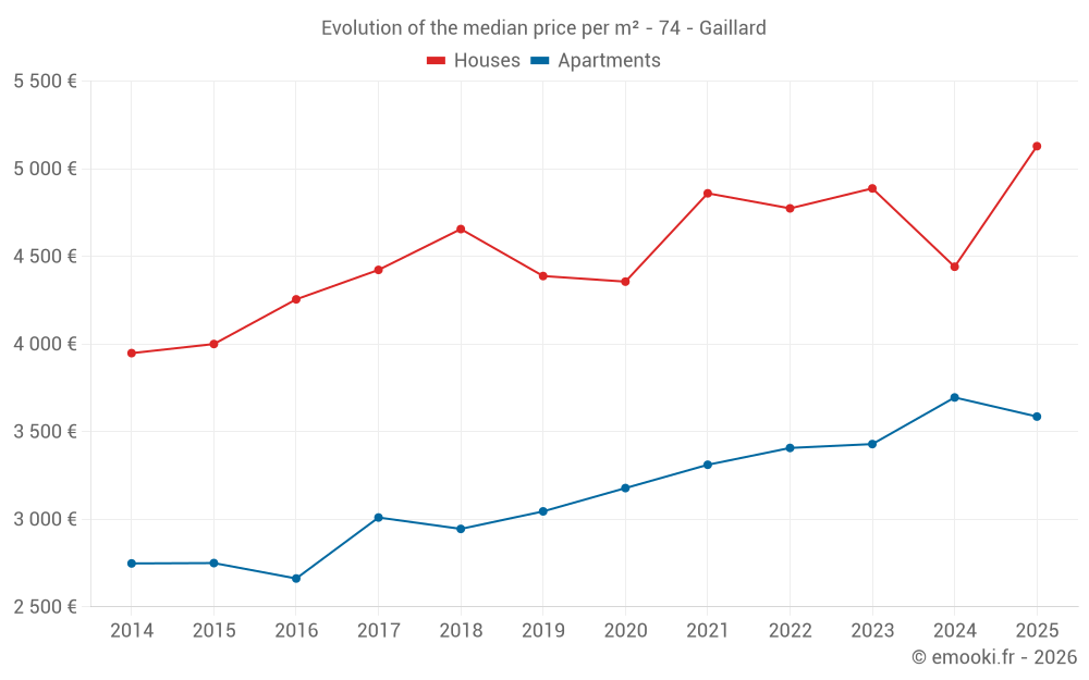 The median price on the 21 house transactions of the last 12 months in the municipality of Gaillard was 4 694 € per square meter for a median property value of 507 800 €. Over this period, 60% of transactions were between 3 666 and 6 188 € per square meter (from the 2nd to the 8th deciles).