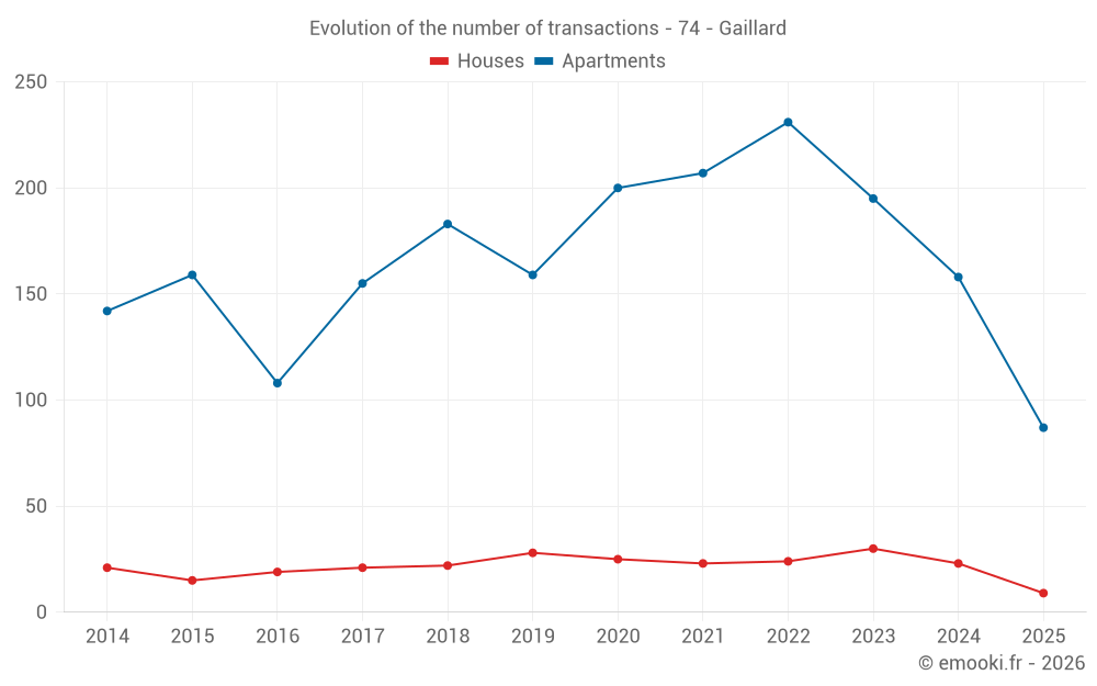 The median price on the 32 apartment transactions of the last 3 months in the municipality of Gaillard was 3 536 € per square meter for a median property value of 122 500 €. Over this period, 60% of transactions were between 1 454 and 4 343 € per square meter (from the 2nd to the 8th deciles).