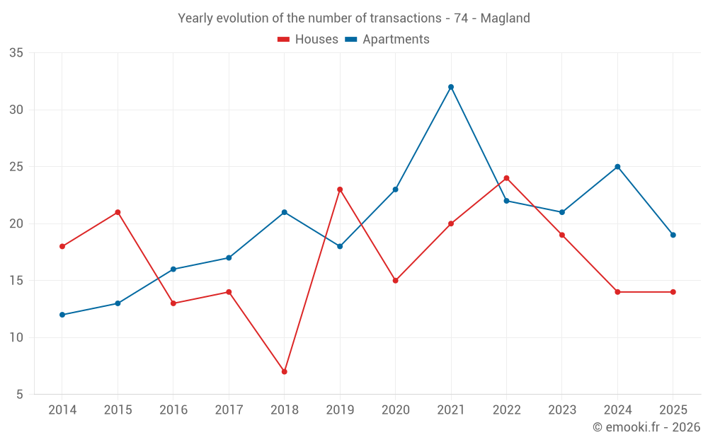 The median price on the 19 apartment transactions of the last 12 months in the municipality of Magland was 2 684 € per square meter for a median property value of 176 000 €. Over this period, 60% of transactions were between 1 674 and 3 306 € per square meter (from the 2nd to the 8th deciles).