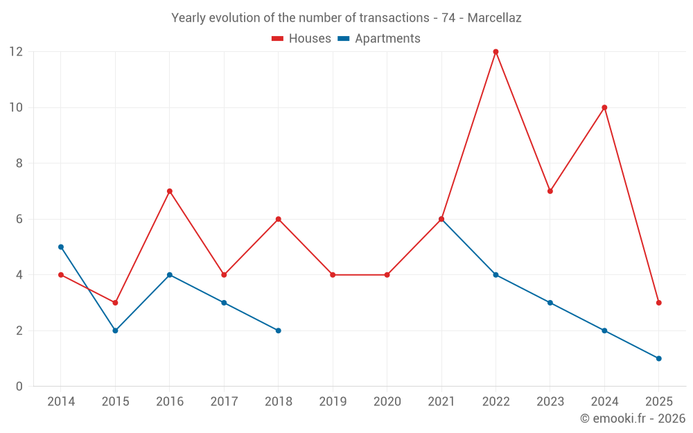 The median price on the 17 house transactions of the last 24 months in the municipality of Marcellaz was 4 938 € per square meter for a median property value of 512 900 €. Over this period, 60% of transactions were between 3 631 and 5 546 € per square meter (from the 2nd to the 8th deciles).
