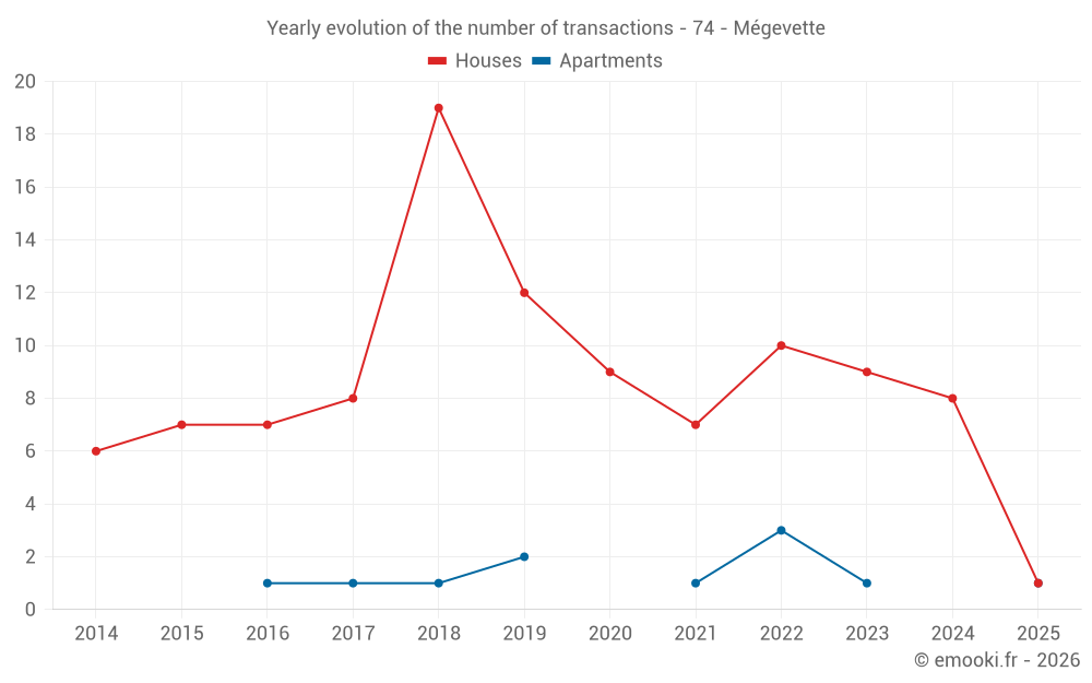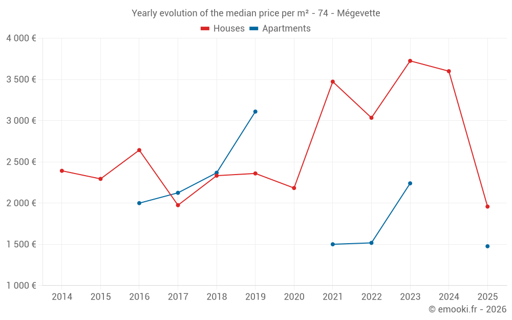 The median price on the 15 house transactions of the last 24 months in the municipality of Mégevette was 3 636 € per square meter for a median property value of 236 550 €. Over this period, 60% of transactions were between 2 124 and 4 844 € per square meter (from the 2nd to the 8th deciles).