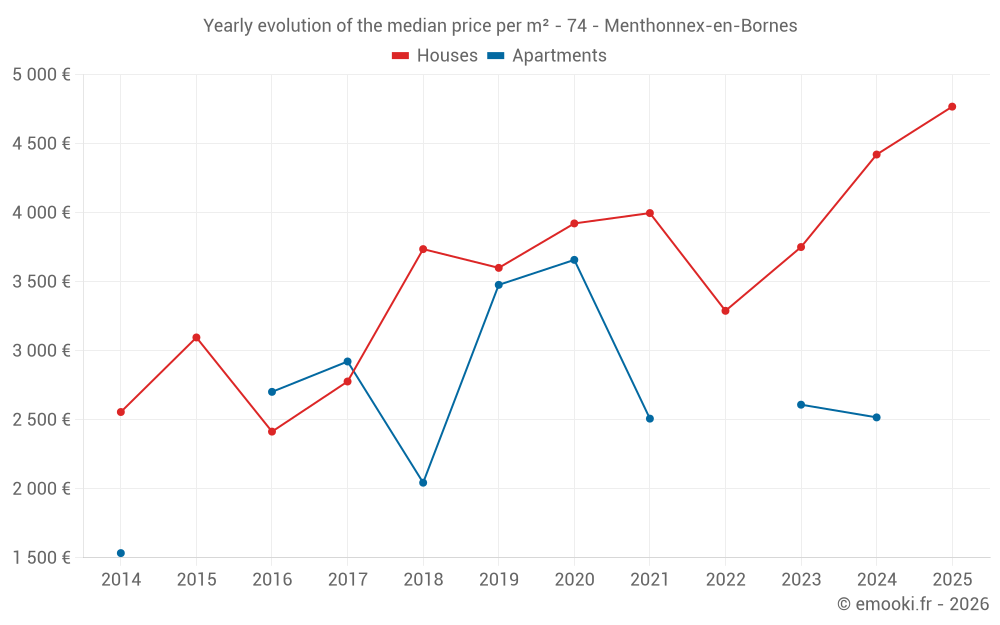 The median price on the 16 house transactions of the last 24 months in the municipality of Menthonnex-en-Bornes was 4 032 € per square meter for a median property value of 427 850 €. Over this period, 60% of transactions were between 2 225 and 4 886 € per square meter (from the 2nd to the 8th deciles).