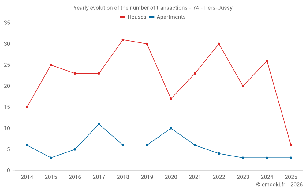 The median price on the 23 house transactions of the last 12 months in the municipality of Pers-Jussy was 4 398 € per square meter for a median property value of 474 210 €. Over this period, 60% of transactions were between 2 910 and 5 256 € per square meter (from the 2nd to the 8th deciles).