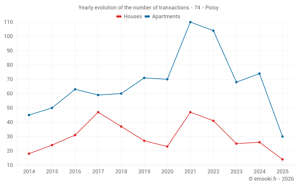 The median price on the 30 apartment transactions of the last 6 months in the municipality of Poisy was 5 170 € per square meter for a median property value of 322 500 €. Over this period, 60% of transactions were between 3 510 and 5 978 € per square meter (from the 2nd to the 8th deciles).