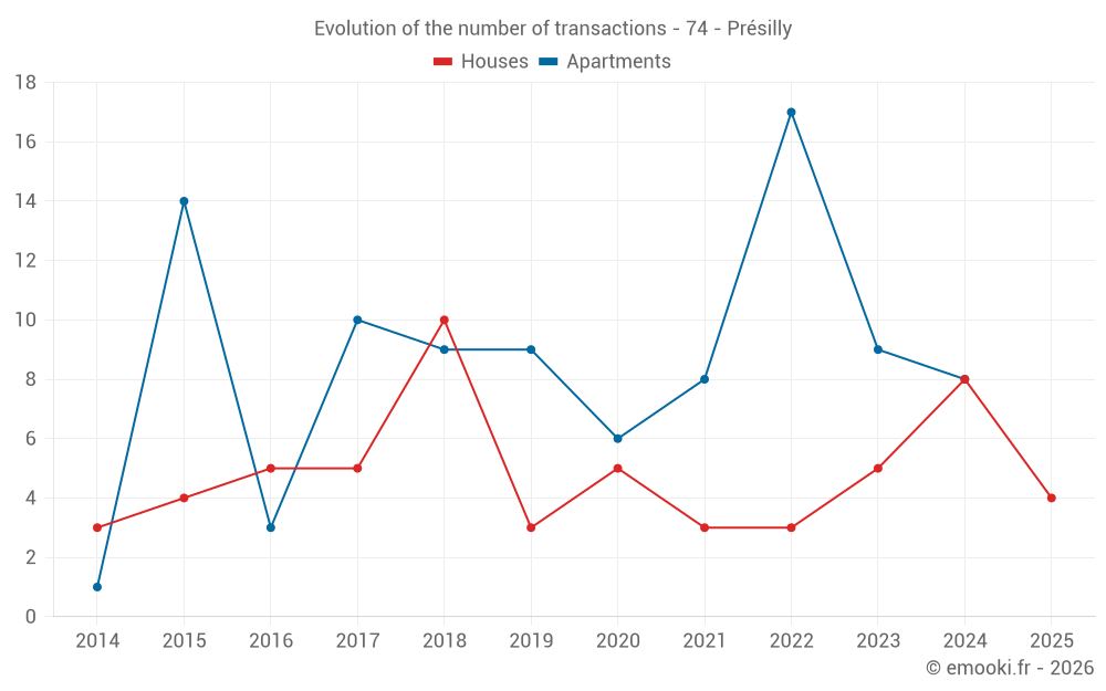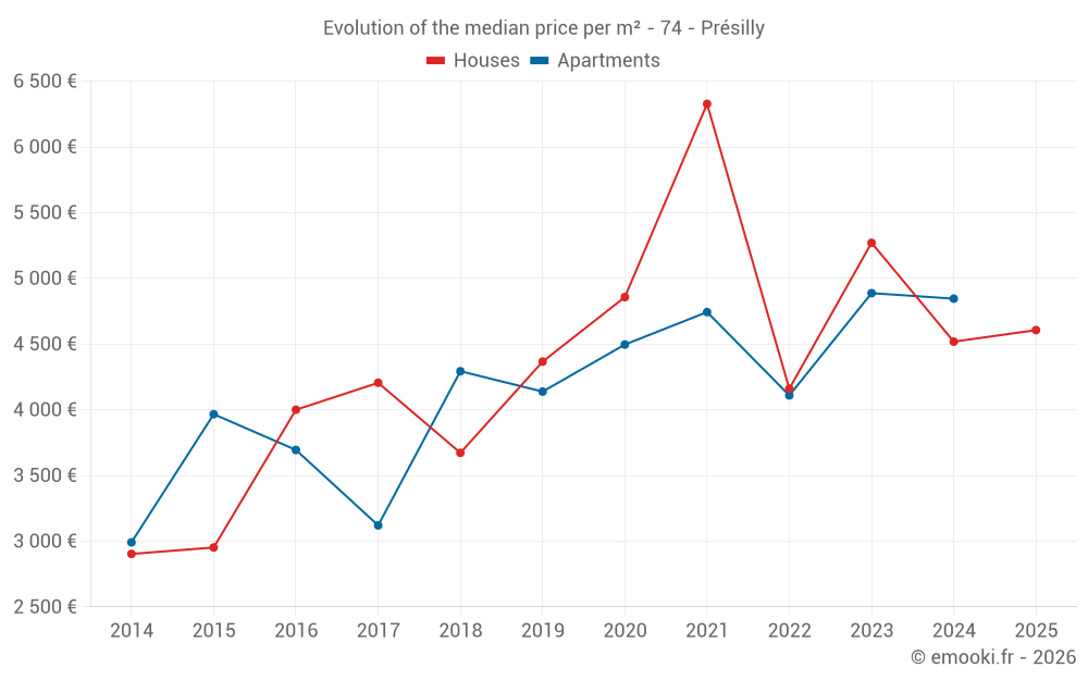 The median price on the 14 house transactions of the last 24 months in the municipality of Présilly was 4 386 € per square meter for a median property value of 633 725 €. Over this period, 60% of transactions were between 2 824 and 5 374 € per square meter (from the 2nd to the 8th deciles).