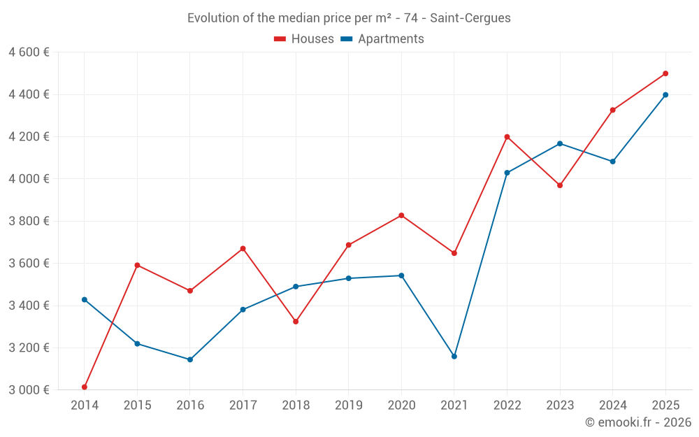 The median price on the 16 house transactions of the last 12 months in the municipality of Saint-Cergues was 4 468 € per square meter for a median property value of 480 500 €. Over this period, 60% of transactions were between 3 453 and 5 877 € per square meter (from the 2nd to the 8th deciles).