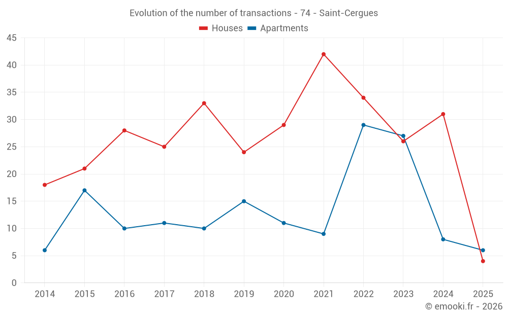The median price on the 28 apartment transactions of the last 24 months in the municipality of Saint-Cergues was 4 290 € per square meter for a median property value of 250 500 €. Over this period, 60% of transactions were between 3 469 and 4 816 € per square meter (from the 2nd to the 8th deciles).