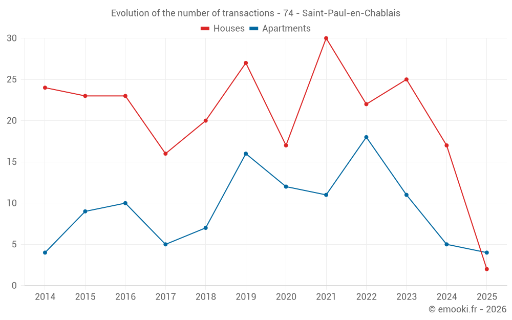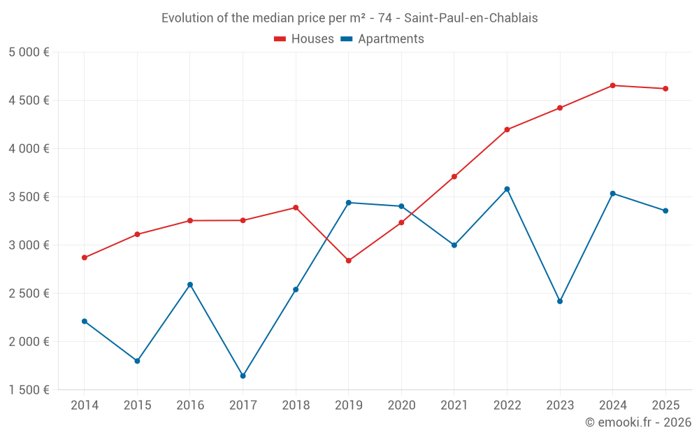 The median price on the 16 house transactions of the last 12 months in the municipality of Saint-Paul-en-Chablais was 5 082 € per square meter for a median property value of 507 950 €. Over this period, 60% of transactions were between 3 986 and 5 641 € per square meter (from the 2nd to the 8th deciles).