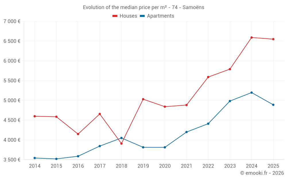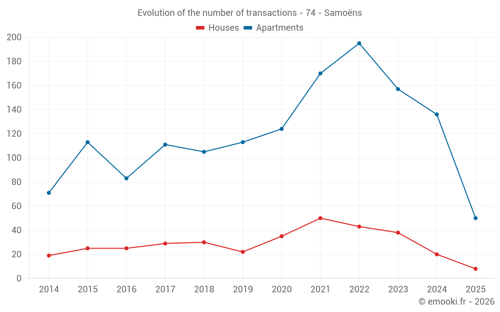 The median price on the 50 apartment transactions of the last 6 months in the municipality of Samoëns was 4 890 € per square meter for a median property value of 187 182 €. Over this period, 60% of transactions were between 3 886 and 6 290 € per square meter (from the 2nd to the 8th deciles).