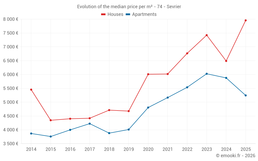 The median price on the 23 apartment transactions of the last 12 months in the municipality of Sevrier was 6 129 € per square meter for a median property value of 444 100 €. Over this period, 60% of transactions were between 4 764 and 6 672 € per square meter (from the 2nd to the 8th deciles).