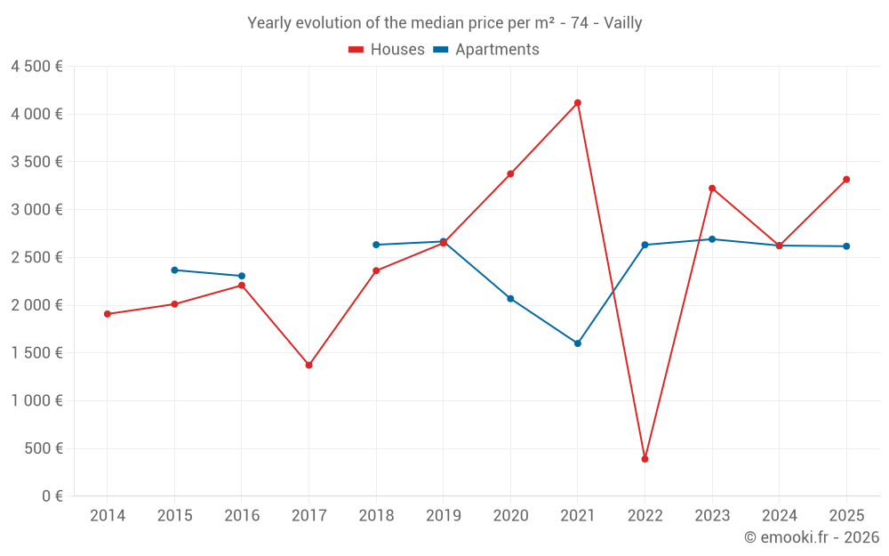 The median price on the 18 house transactions of the last 24 months in the municipality of Vailly was 2 622 € per square meter for a median property value of 295 000 €. Over this period, 60% of transactions were between 1 831 and 5 149 € per square meter (from the 2nd to the 8th deciles).
