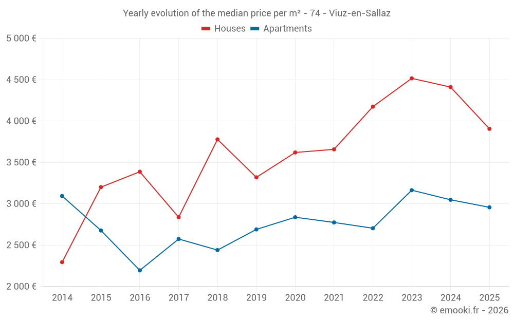 The median price on the 26 house transactions of the last 12 months in the municipality of Viuz-en-Sallaz was 4 000 € per square meter for a median property value of 394 500 €. Over this period, 60% of transactions were between 2 976 and 4 875 € per square meter (from the 2nd to the 8th deciles).