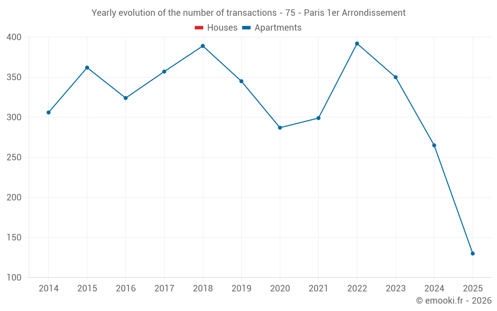 The median price on the 46 apartment transactions of the last 3 months in the municipality of Paris 1er Arrondissement was 12 332 € per square meter for a median property value of 403 442 €. Over this period, 60% of transactions were between 9 143 and 15 522 € per square meter (from the 2nd to the 8th deciles).