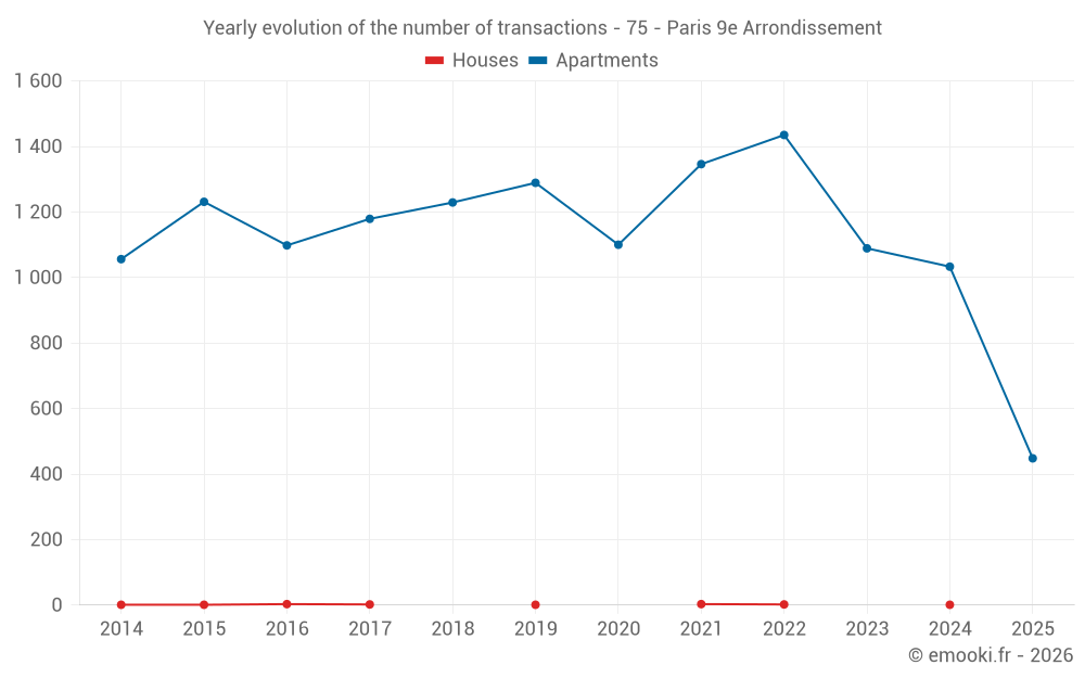 The median price on the 148 apartment transactions of the last 3 months in the municipality of Paris 9e Arrondissement was 10 552 € per square meter for a median property value of 350 500 €. Over this period, 60% of transactions were between 8 485 and 12 372 € per square meter (from the 2nd to the 8th deciles).