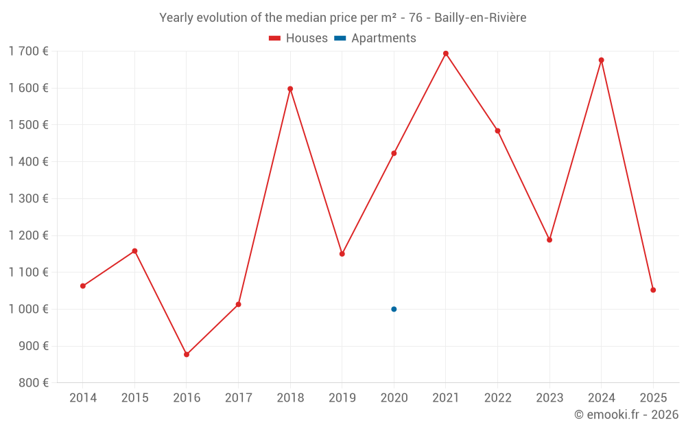 The median price on the 16 house transactions of the last 24 months in the municipality of Bailly-en-Rivière was 1 390 € per square meter for a median property value of 127 200 €. Over this period, 60% of transactions were between 1 113 and 2 288 € per square meter (from the 2nd to the 8th deciles).