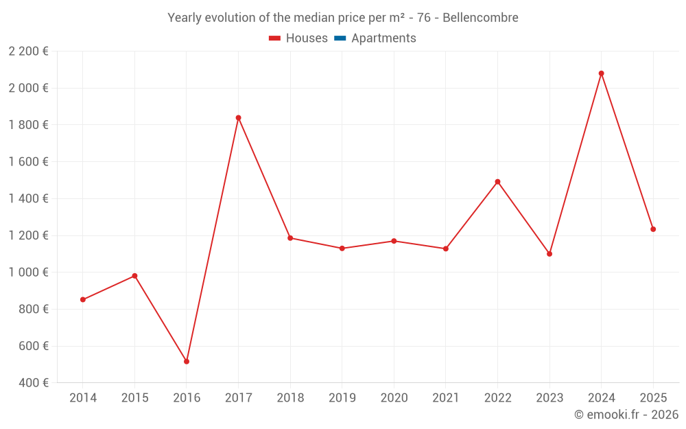 The median price on the 14 house transactions of the last 24 months in the municipality of Bellencombre was 1 412 € per square meter for a median property value of 123 000 €. Over this period, 60% of transactions were between 1 072 and 2 177 € per square meter (from the 2nd to the 8th deciles).
