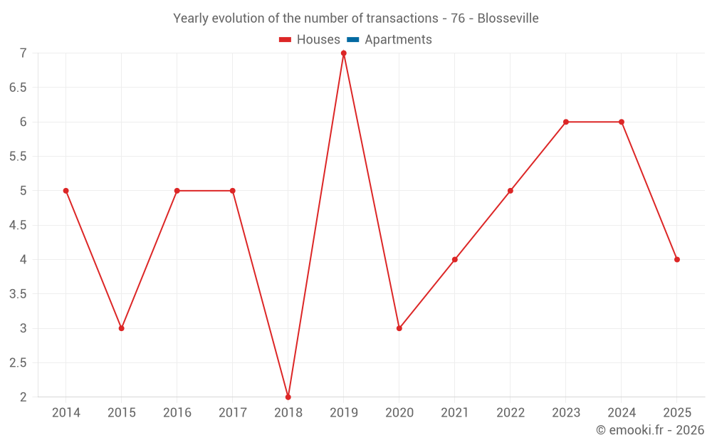 The median price on the 14 house transactions of the last 24 months in the municipality of Blosseville was 1 770 € per square meter for a median property value of 164 875 €. Over this period, 60% of transactions were between 1 073 and 2 371 € per square meter (from the 2nd to the 8th deciles).