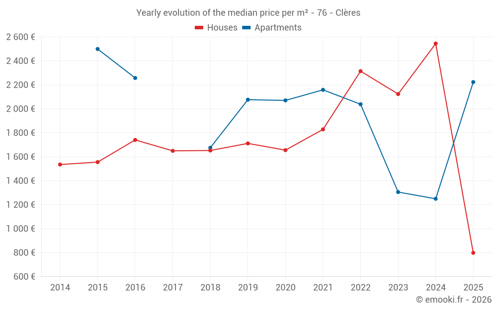 The median price on the 14 house transactions of the last 24 months in the municipality of Clères was 2 426 € per square meter for a median property value of 240 000 €. Over this period, 60% of transactions were between 1 730 and 2 624 € per square meter (from the 2nd to the 8th deciles).