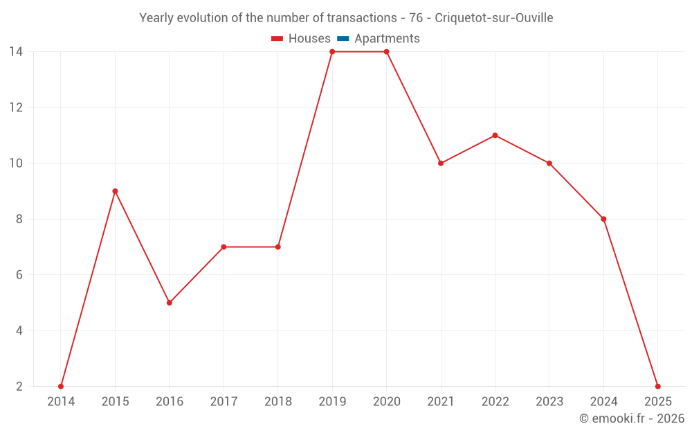 The median price on the 16 house transactions of the last 24 months in the municipality of Criquetot-sur-Ouville was 1 786 € per square meter for a median property value of 152 500 €. Over this period, 60% of transactions were between 1 576 and 2 222 € per square meter (from the 2nd to the 8th deciles).