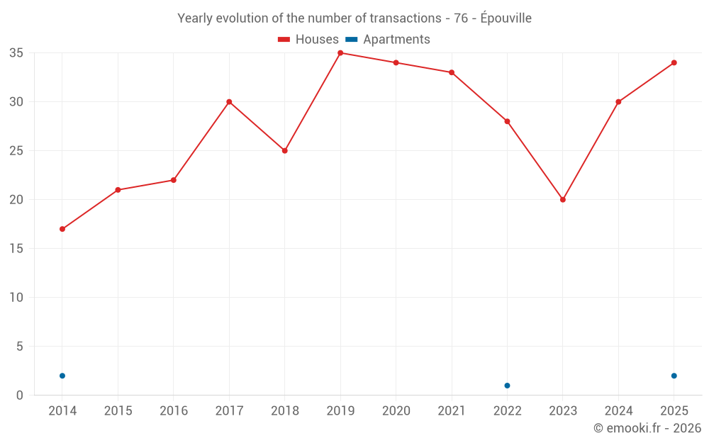 The median price on the 34 house transactions of the last 12 months in the municipality of Épouville was 2 396 € per square meter for a median property value of 221 250 €. Over this period, 60% of transactions were between 2 028 and 2 811 € per square meter (from the 2nd to the 8th deciles).
