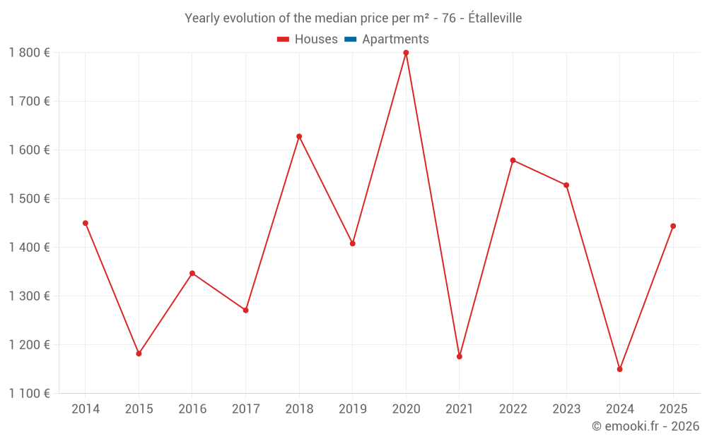 The price per m² of houses has increased by 23% since 4 years, but it has decreased by 20% in 5 years.