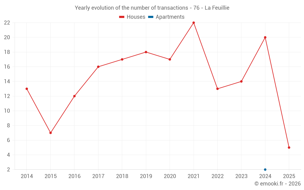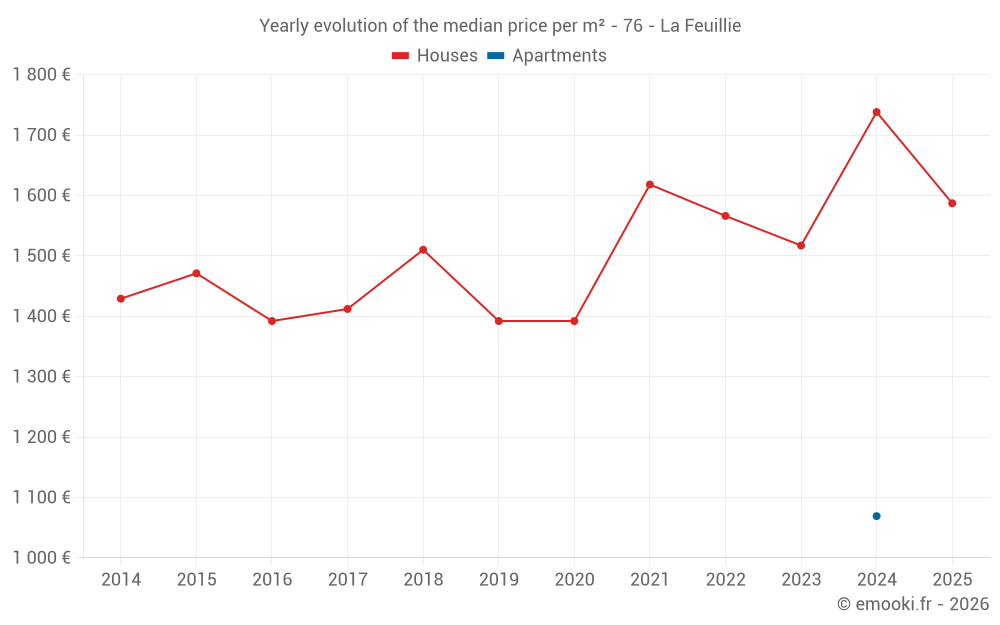 The median price on the 18 house transactions of the last 12 months in the municipality of La Feuillie was 1 622 € per square meter for a median property value of 197 500 €. Over this period, 60% of transactions were between 1 330 and 2 257 € per square meter (from the 2nd to the 8th deciles).
