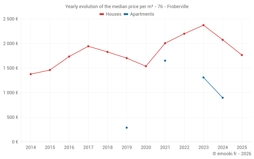 The median price on the 23 house transactions of the last 24 months in the municipality of Froberville was 2 108 € per square meter for a median property value of 202 000 €. Over this period, 60% of transactions were between 1 701 and 2 420 € per square meter (from the 2nd to the 8th deciles).