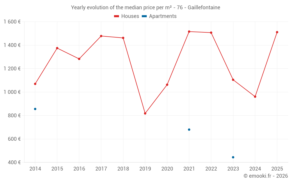 The median price on the 16 house transactions of the last 12 months in the municipality of Gaillefontaine was 1 251 € per square meter for a median property value of 125 550 €. Over this period, 60% of transactions were between 533 and 1 685 € per square meter (from the 2nd to the 8th deciles).