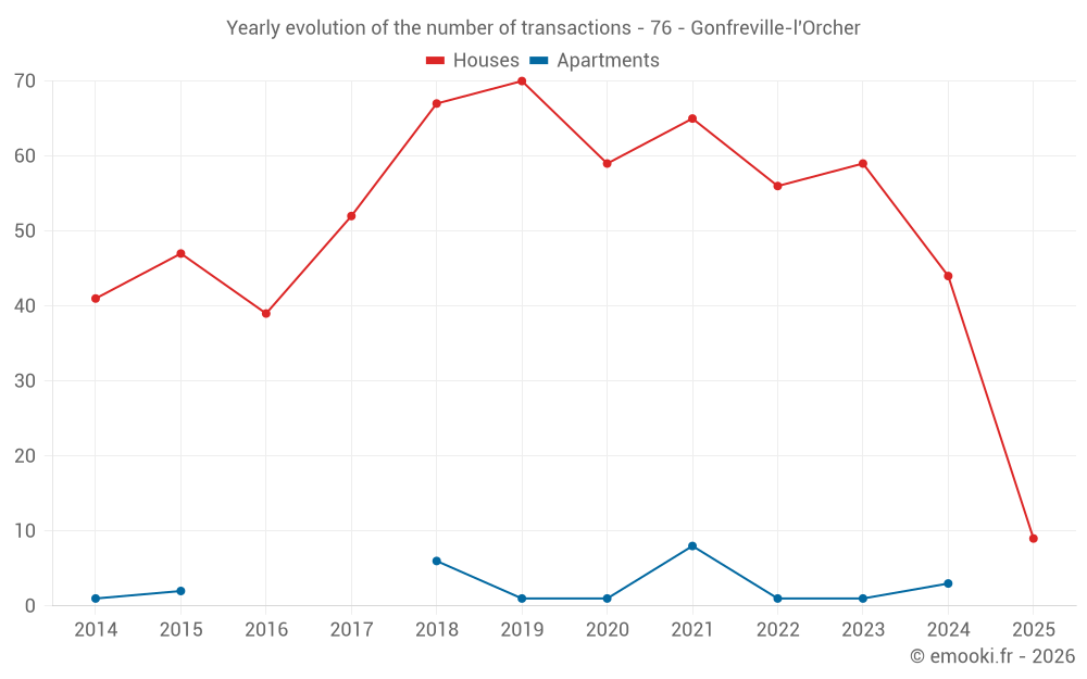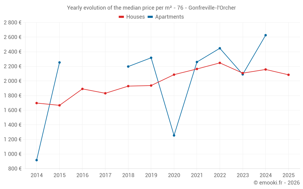 The median price on the 27 house transactions of the last 12 months in the municipality of Gonfreville-l'Orcher was 2 157 € per square meter for a median property value of 198 000 €. Over this period, 60% of transactions were between 1 484 and 2 467 € per square meter (from the 2nd to the 8th deciles).