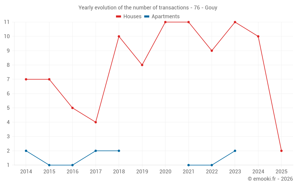 The median price on the 16 house transactions of the last 24 months in the municipality of Gouy was 2 428 € per square meter for a median property value of 257 000 €. Over this period, 60% of transactions were between 1 473 and 2 686 € per square meter (from the 2nd to the 8th deciles).