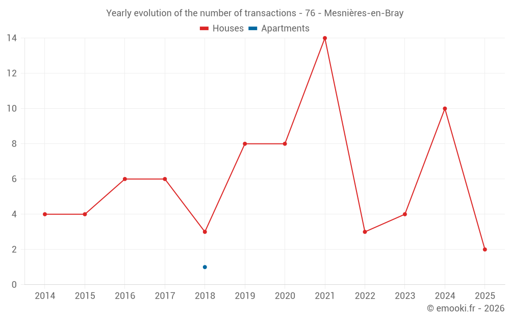 The median price on the 15 house transactions of the last 24 months in the municipality of Mesnières-en-Bray was 1 610 € per square meter for a median property value of 145 000 €. Over this period, 60% of transactions were between 1 086 and 1 959 € per square meter (from the 2nd to the 8th deciles).