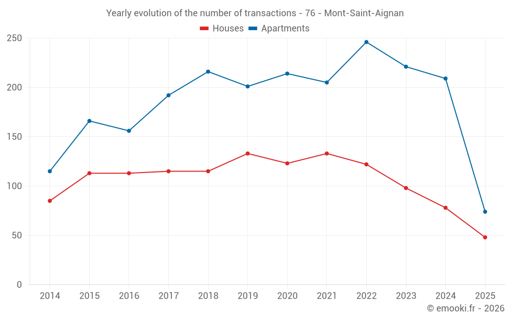 The median price on the 32 apartment transactions of the last 3 months in the municipality of Mont-Saint-Aignan was 2 091 € per square meter for a median property value of 128 050 €. Over this period, 60% of transactions were between 1 538 and 2 801 € per square meter (from the 2nd to the 8th deciles).