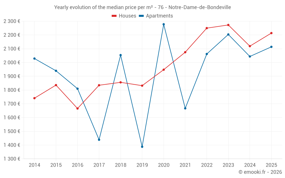 The median price on the 18 house transactions of the last 6 months in the municipality of Notre-Dame-de-Bondeville was 2 214 € per square meter for a median property value of 178 100 €. Over this period, 60% of transactions were between 1 928 and 2 426 € per square meter (from the 2nd to the 8th deciles).