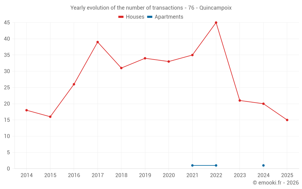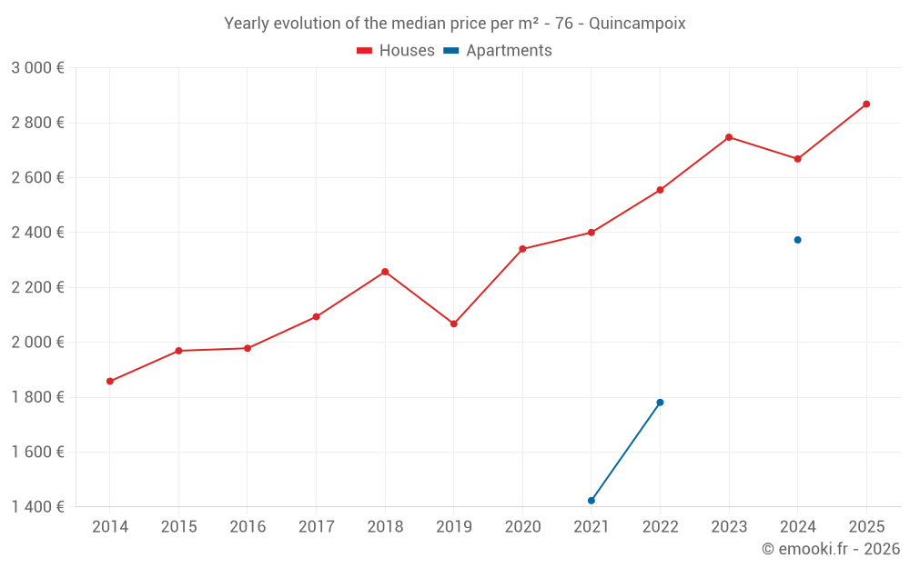 The median price on the 25 house transactions of the last 12 months in the municipality of Quincampoix was 2 846 € per square meter for a median property value of 337 800 €. Over this period, 60% of transactions were between 2 310 and 3 172 € per square meter (from the 2nd to the 8th deciles).