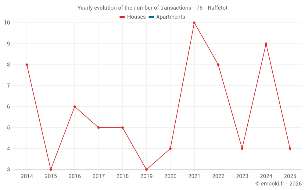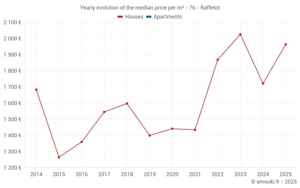 The median price on the 16 house transactions of the last 24 months in the municipality of Raffetot was 1 725 € per square meter for a median property value of 160 725 €. Over this period, 60% of transactions were between 1 300 and 2 435 € per square meter (from the 2nd to the 8th deciles).