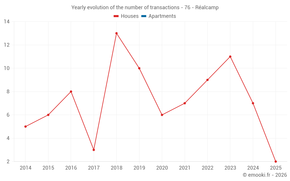 The median price on the 17 house transactions of the last 24 months in the municipality of Réalcamp was 1 394 € per square meter for a median property value of 93 000 €. Over this period, 60% of transactions were between 926 and 2 141 € per square meter (from the 2nd to the 8th deciles).