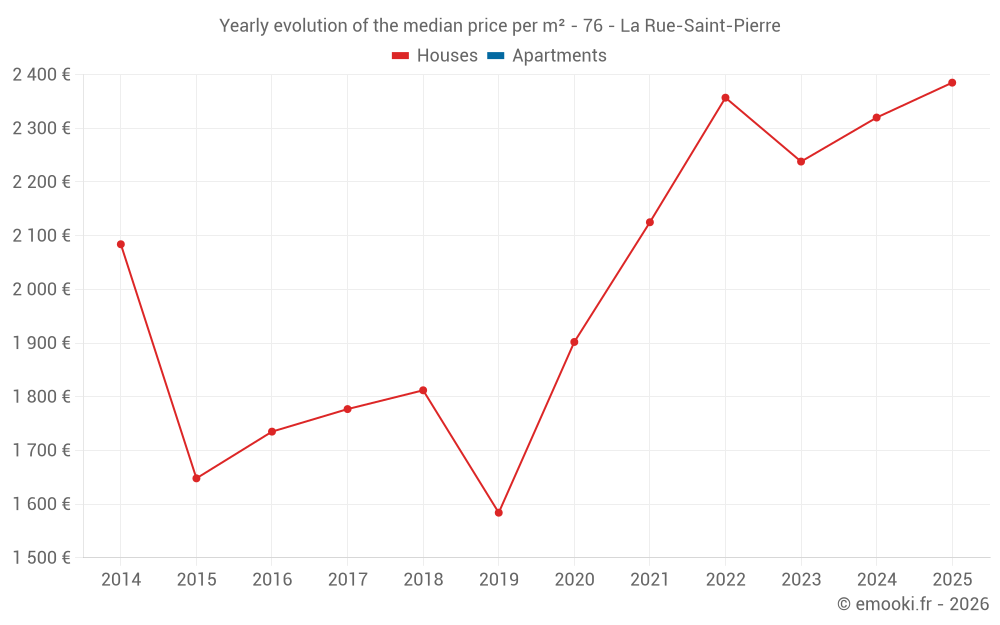 The median price on the 17 house transactions of the last 24 months in the municipality of La Rue-Saint-Pierre was 2 320 € per square meter for a median property value of 260 000 €. Over this period, 60% of transactions were between 1 955 and 2 738 € per square meter (from the 2nd to the 8th deciles).