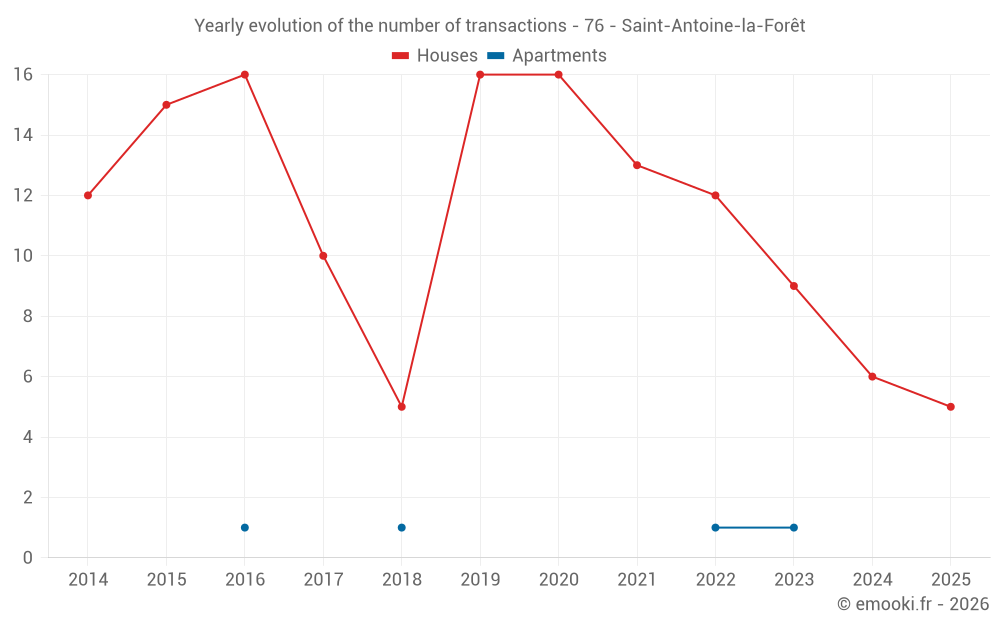 The median price on the 17 house transactions of the last 24 months in the municipality of Saint-Antoine-la-Forêt was 2 037 € per square meter for a median property value of 227 000 €. Over this period, 60% of transactions were between 1 926 and 2 261 € per square meter (from the 2nd to the 8th deciles).