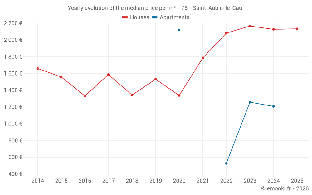 The median price on the 21 house transactions of the last 24 months in the municipality of Saint-Aubin-le-Cauf was 2 188 € per square meter for a median property value of 190 000 €. Over this period, 60% of transactions were between 1 813 and 2 527 € per square meter (from the 2nd to the 8th deciles).