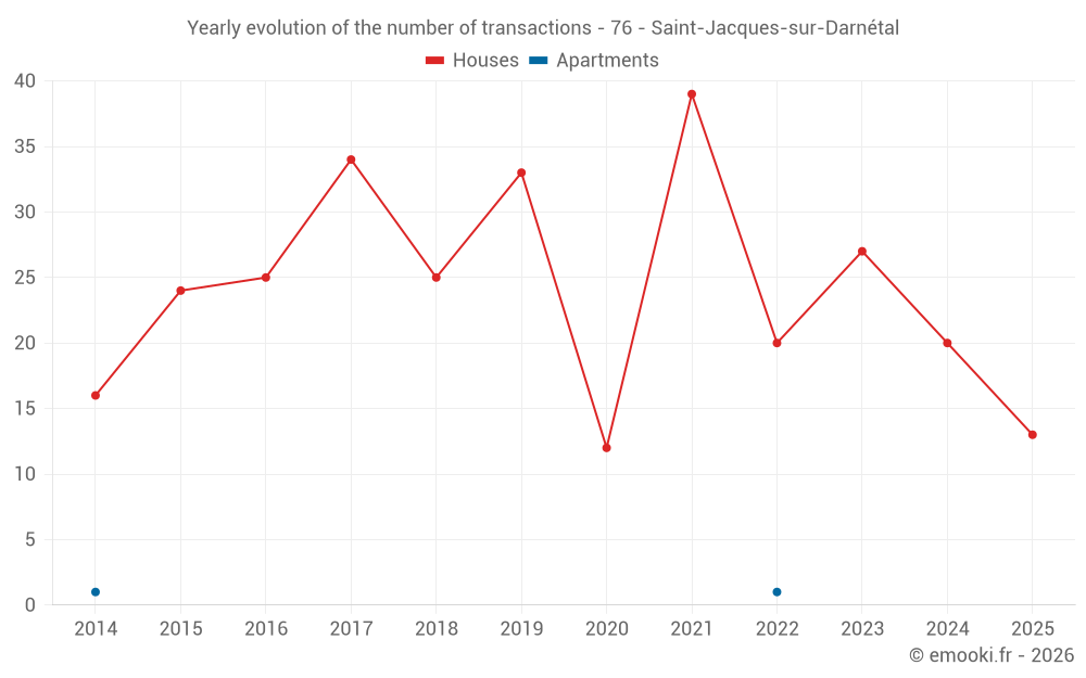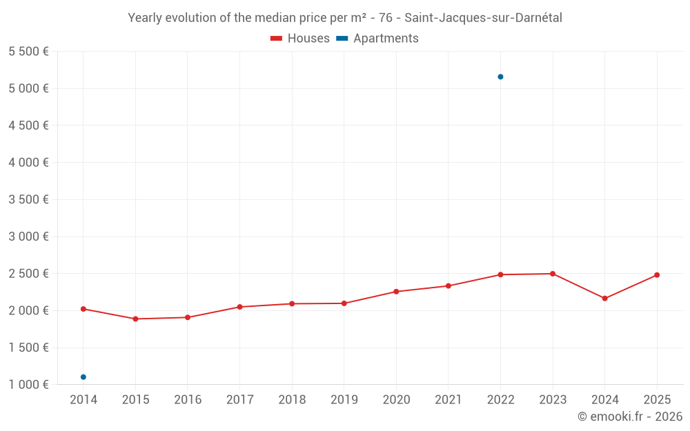 The median price on the 24 house transactions of the last 12 months in the municipality of Saint-Jacques-sur-Darnétal was 2 383 € per square meter for a median property value of 240 000 €. Over this period, 60% of transactions were between 1 865 and 3 080 € per square meter (from the 2nd to the 8th deciles).