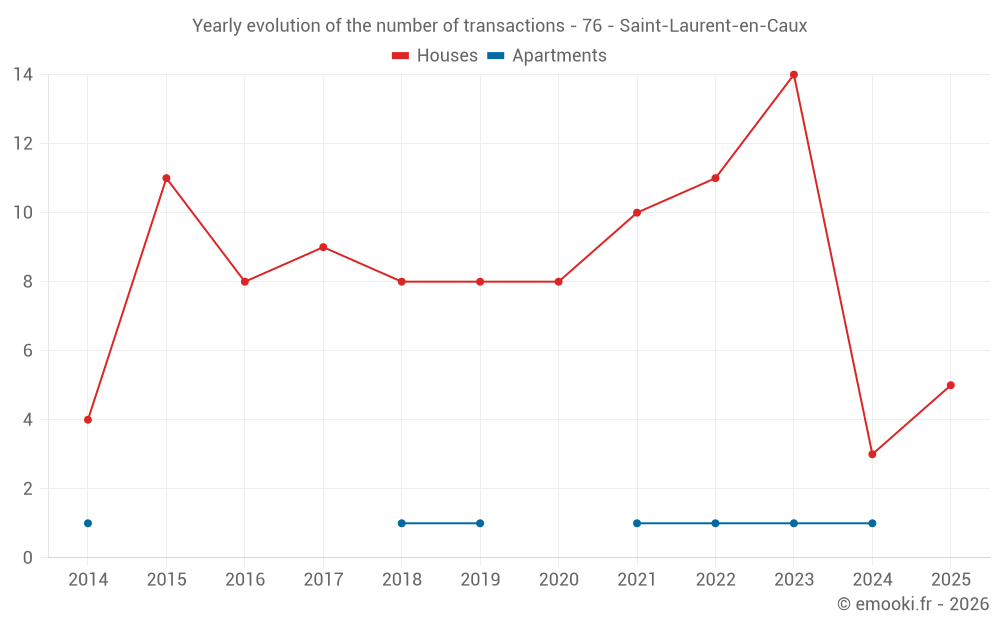 The median price on the 16 house transactions of the last 24 months in the municipality of Saint-Laurent-en-Caux was 1 444 € per square meter for a median property value of 103 000 €. Over this period, 60% of transactions were between 955 and 2 165 € per square meter (from the 2nd to the 8th deciles).