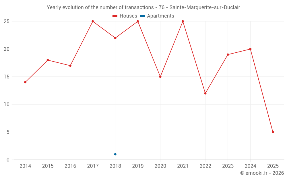 The median price on the 16 house transactions of the last 12 months in the municipality of Sainte-Marguerite-sur-Duclair was 2 154 € per square meter for a median property value of 234 350 €. Over this period, 60% of transactions were between 1 814 and 2 482 € per square meter (from the 2nd to the 8th deciles).