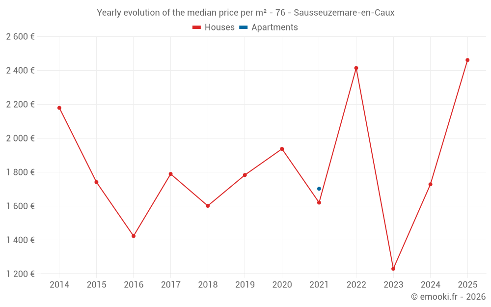 The median price on the 14 house transactions of the last 24 months in the municipality of Sausseuzemare-en-Caux was 1 614 € per square meter for a median property value of 163 000 €. Over this period, 60% of transactions were between 967 and 2 352 € per square meter (from the 2nd to the 8th deciles).