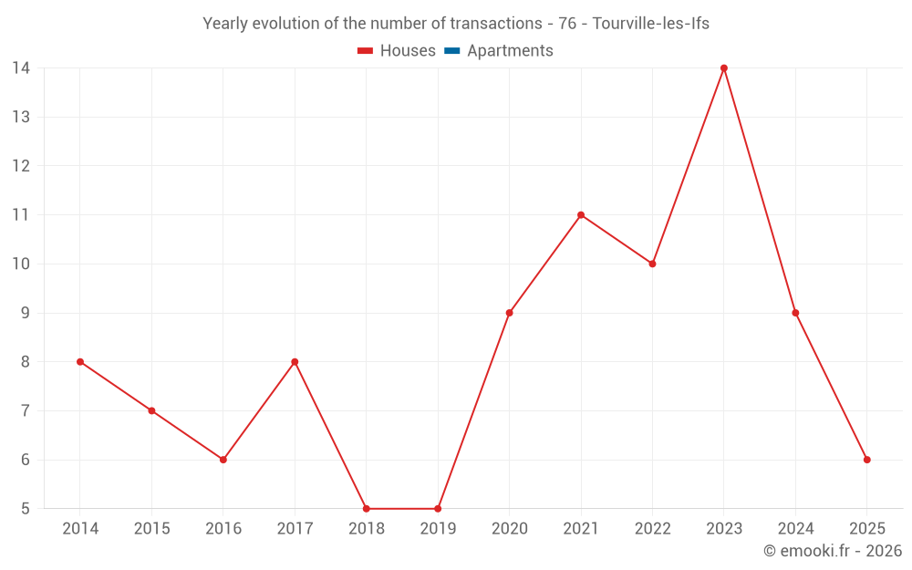 The median price on the 19 house transactions of the last 24 months in the municipality of Tourville-les-Ifs was 2 113 € per square meter for a median property value of 229 470 €. Over this period, 60% of transactions were between 1 797 and 2 834 € per square meter (from the 2nd to the 8th deciles).