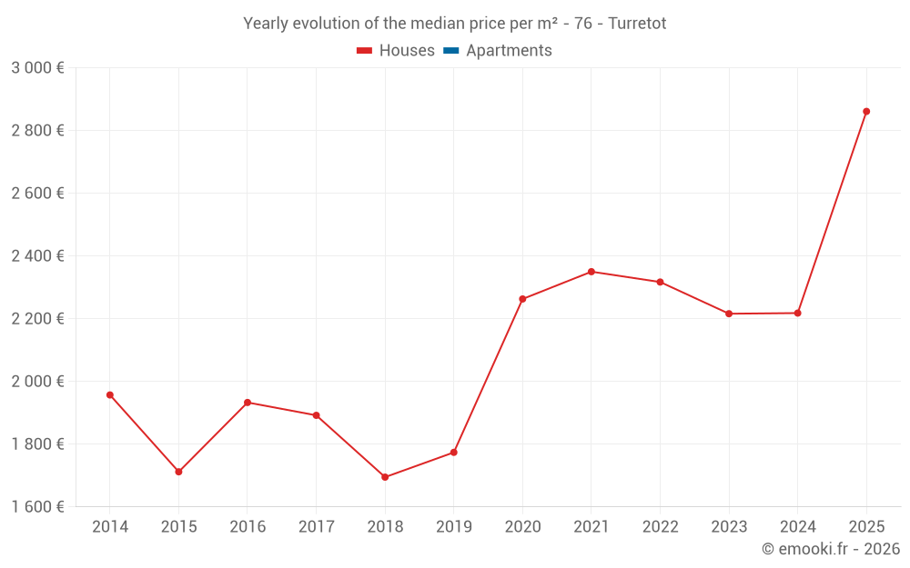 The median price on the 26 house transactions of the last 24 months in the municipality of Turretot was 2 257 € per square meter for a median property value of 244 500 €. Over this period, 60% of transactions were between 2 014 and 2 597 € per square meter (from the 2nd to the 8th deciles).