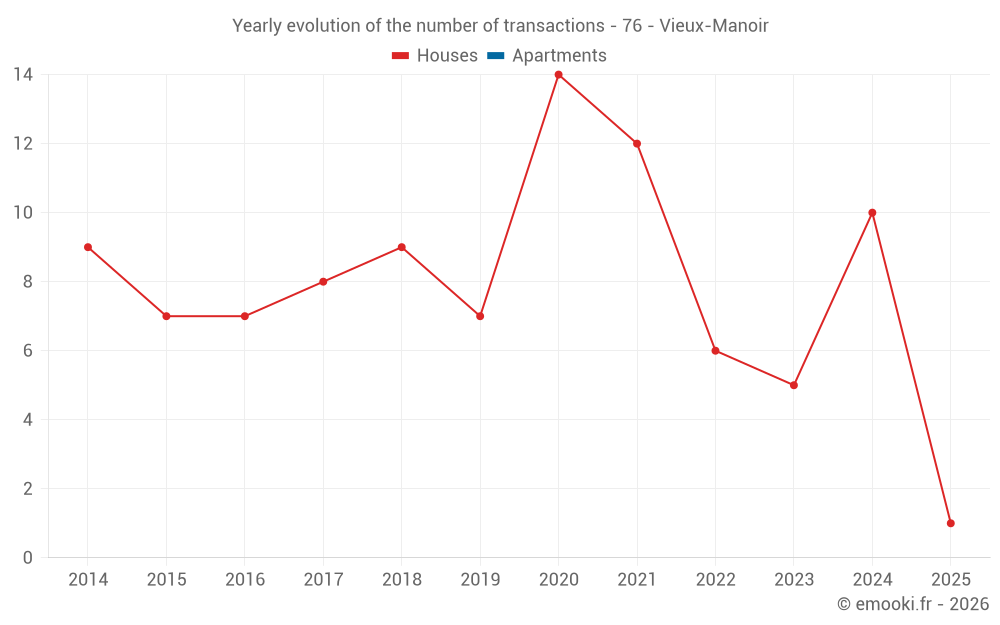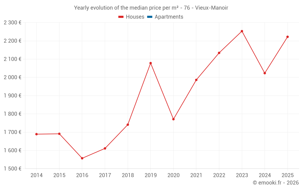 The median price on the 15 house transactions of the last 24 months in the municipality of Vieux-Manoir was 2 079 € per square meter for a median property value of 220 000 €. Over this period, 60% of transactions were between 1 524 and 2 353 € per square meter (from the 2nd to the 8th deciles).