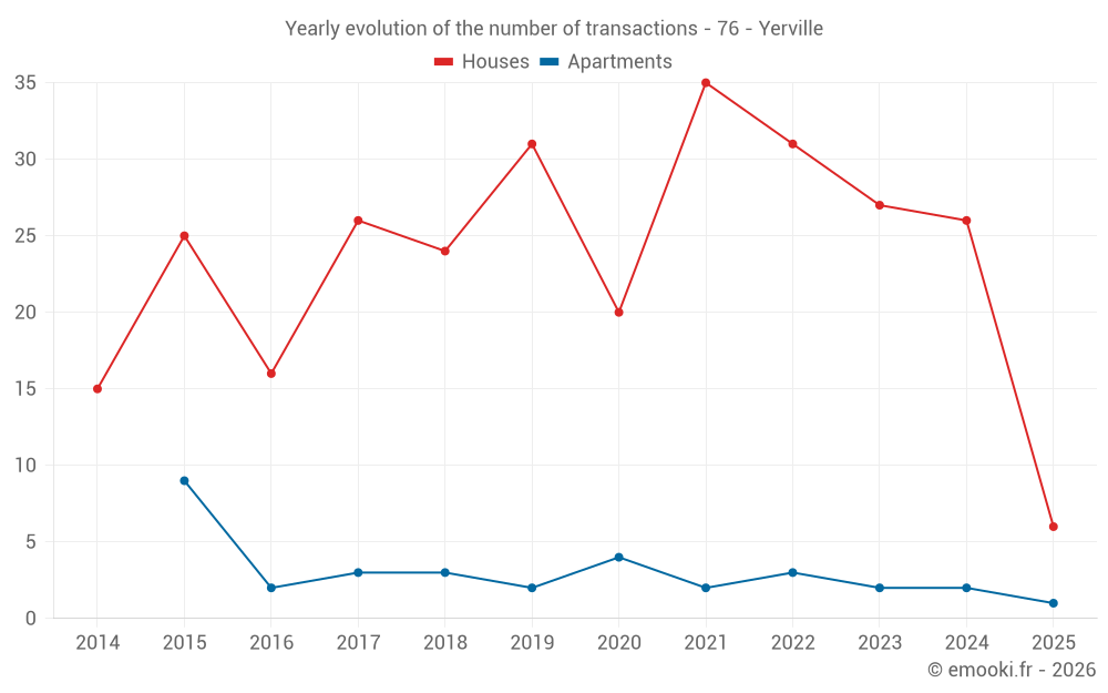 The median price on the 22 house transactions of the last 12 months in the municipality of Yerville was 1 908 € per square meter for a median property value of 182 500 €. Over this period, 60% of transactions were between 1 496 and 2 511 € per square meter (from the 2nd to the 8th deciles).